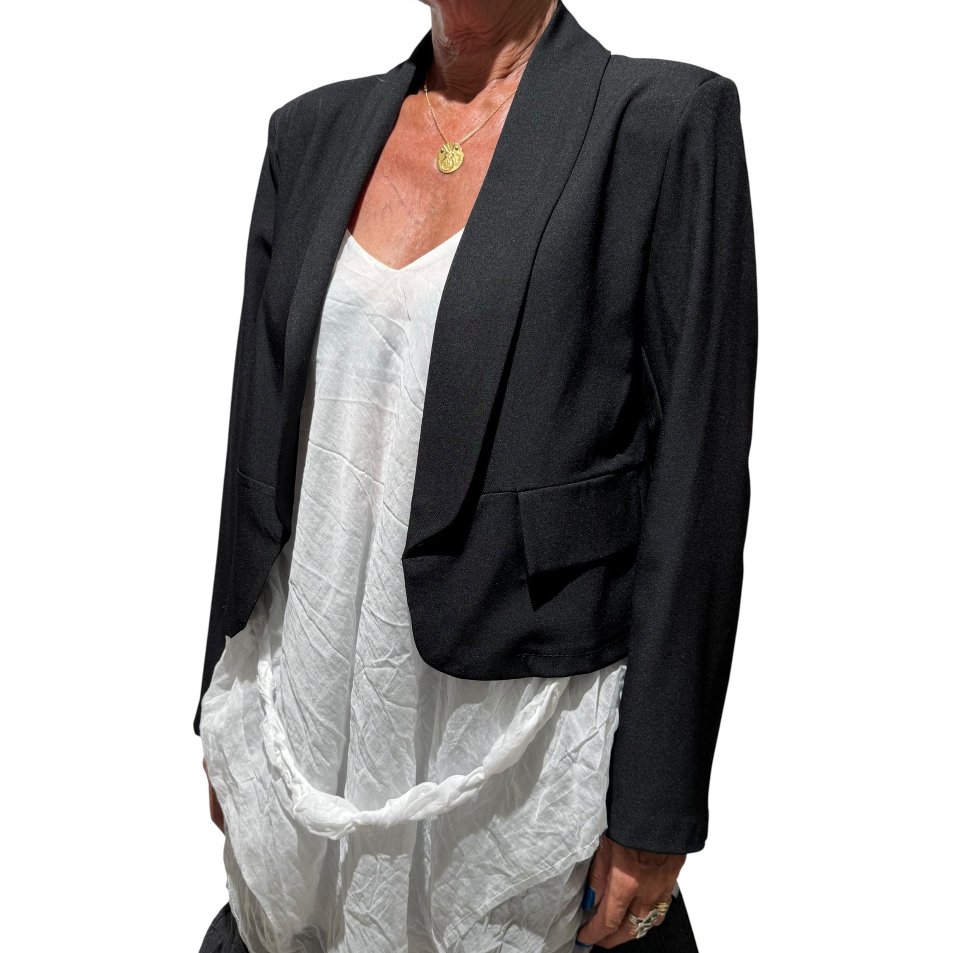 Questo blazer nero è un must-have per ogni guardaroba. Realizzato in taglia unica, presenta una lunghezza corta che lo rende versatile e chic. Le spalline aggiungono un tocco di eleganza, perfetto per un look professionale. Aggiungi questo blazer alla tua collezione e stupisci con stile e raffinatezza.