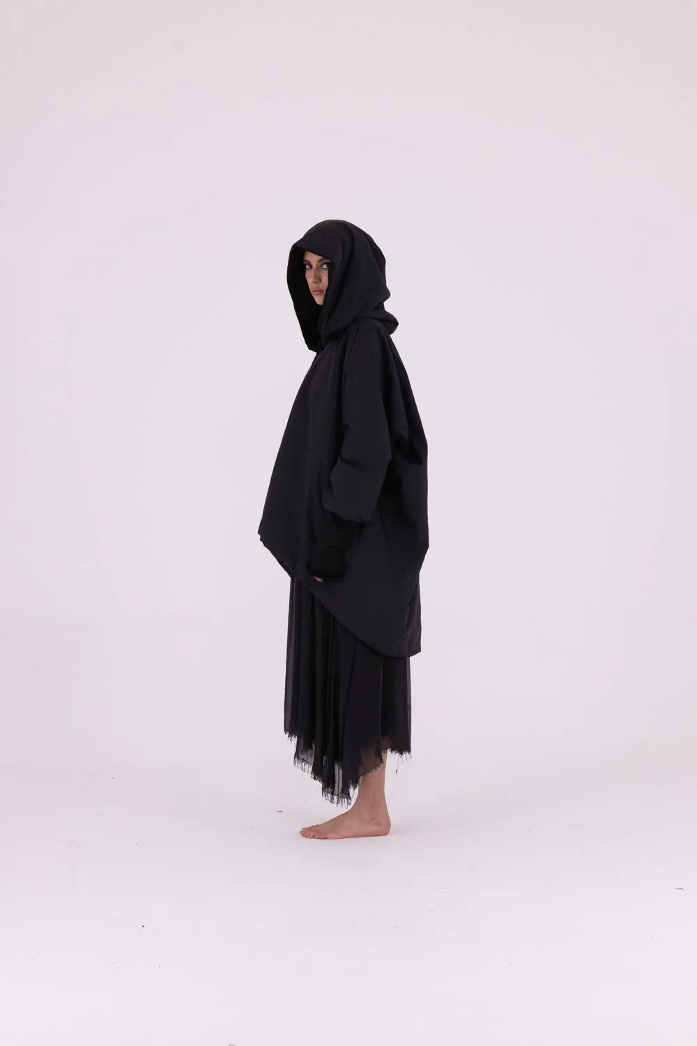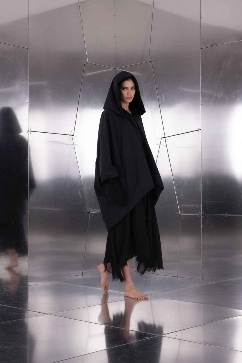 Piumino super soft over, midi asimmetrico super soft, maltinto con collo a sciarpa asimmetrico, foderato con cappuccio ampio e maniche in costina finite con oblò per pollice