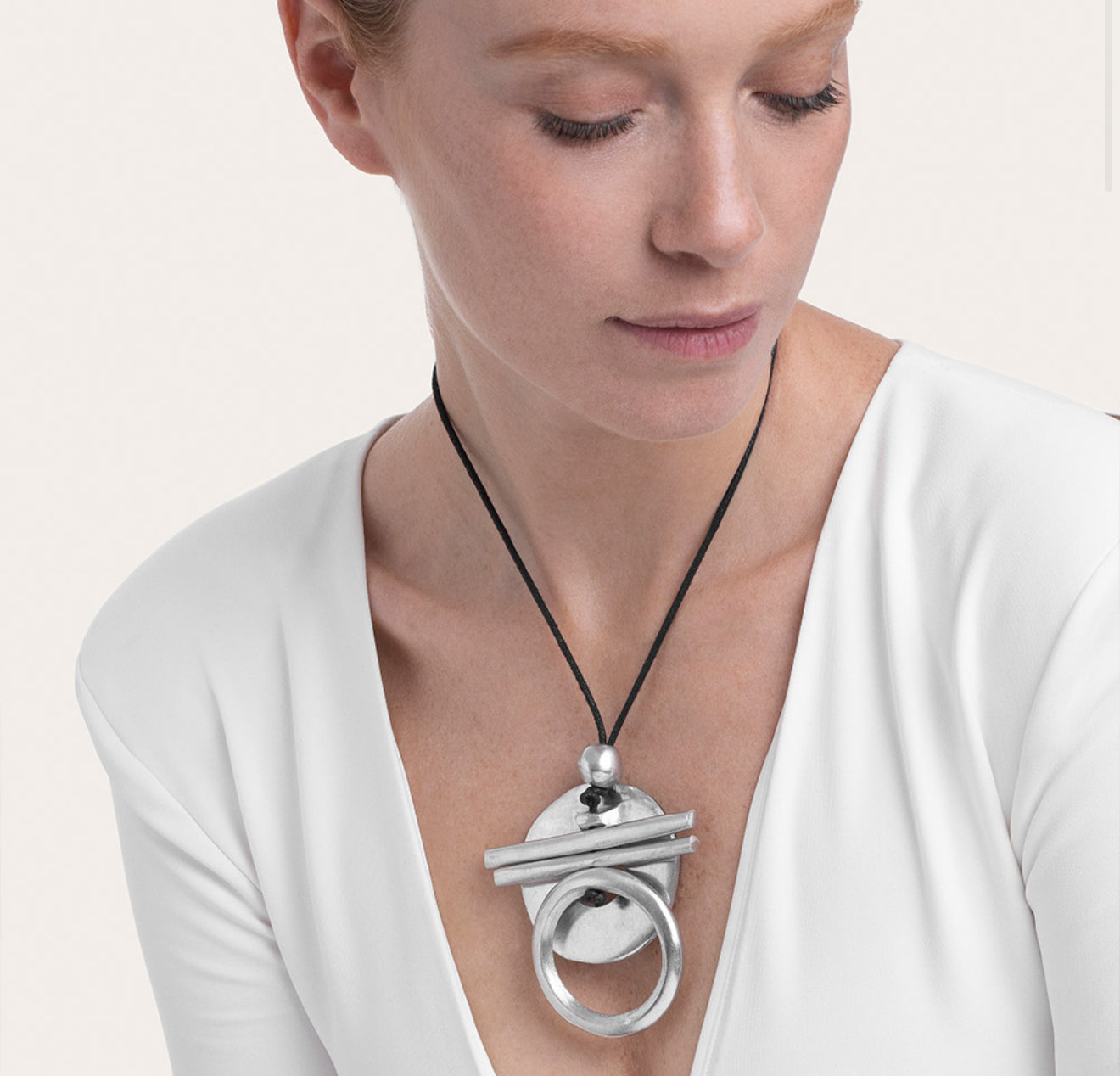 Pendente filo con ciondolo composto da una barra e due tondi. Modello regolabile. Misura totale del ciondolo 8 cm circa. Realizzato a mano in alluminio 100% riciclato. Nickel tested. Lavorazione artigianale. Gioielli fatti a mano, unici e artigianali, perfetti per tutti i tuoi look o come idea regalo. Le misure indicate possono essere soggette a piccole variazioni date dall'artigianalità del prodotto.