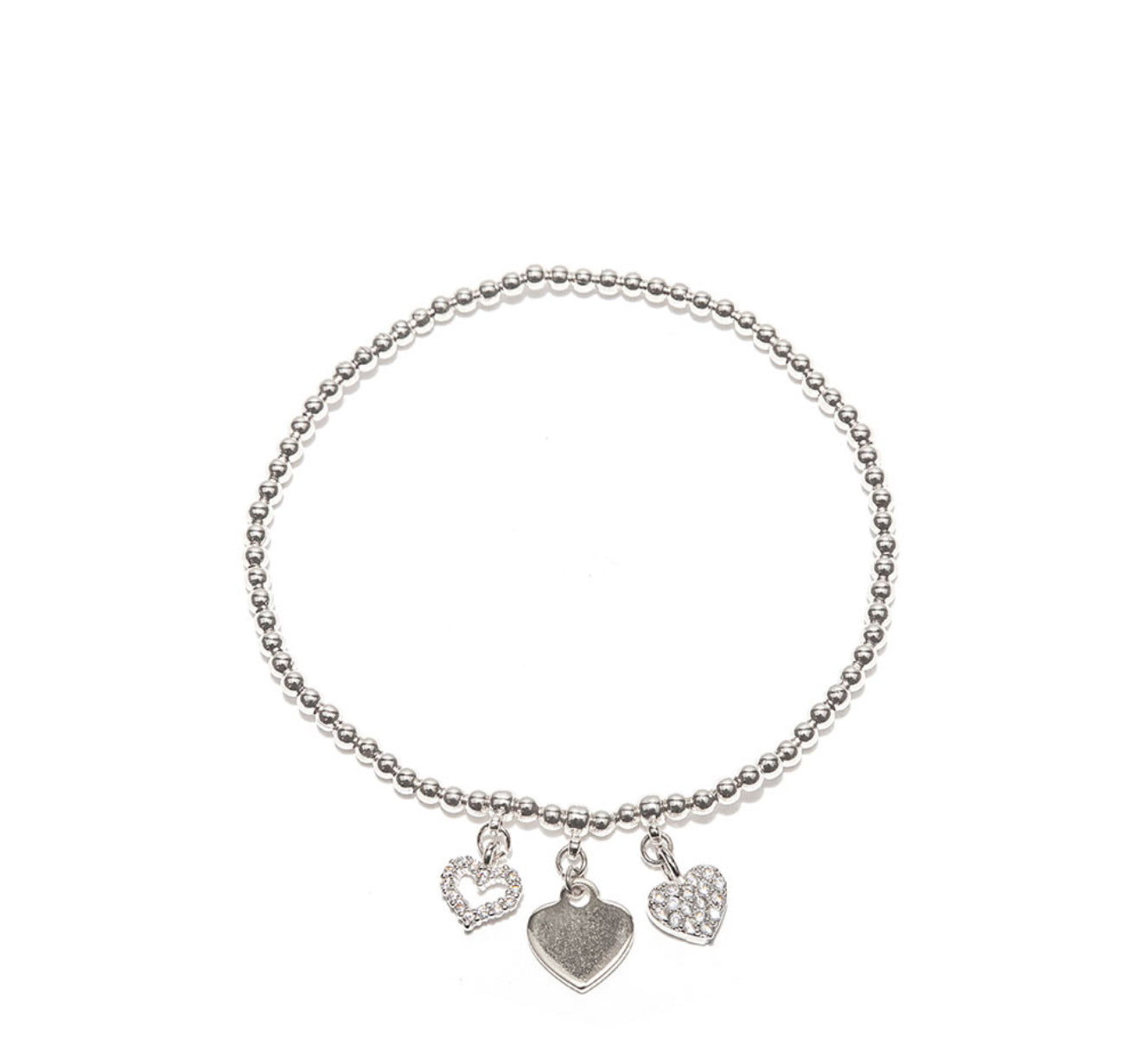 Bracciale elastico tris cuori. Pietre in zirconia. Placcatura in argento. Nickel tested. Lavorazione artigianale.