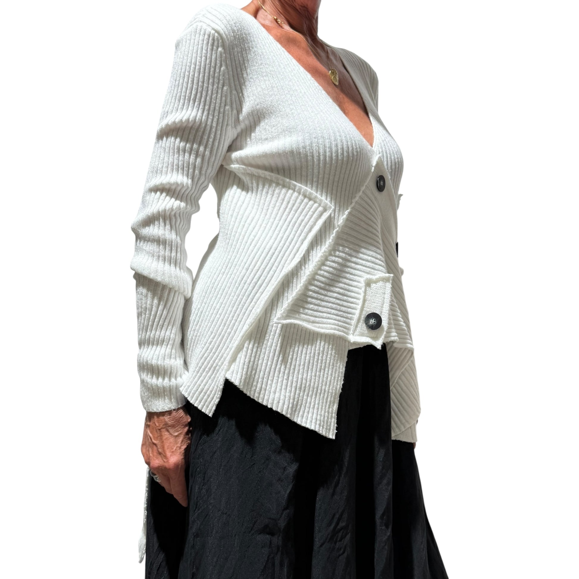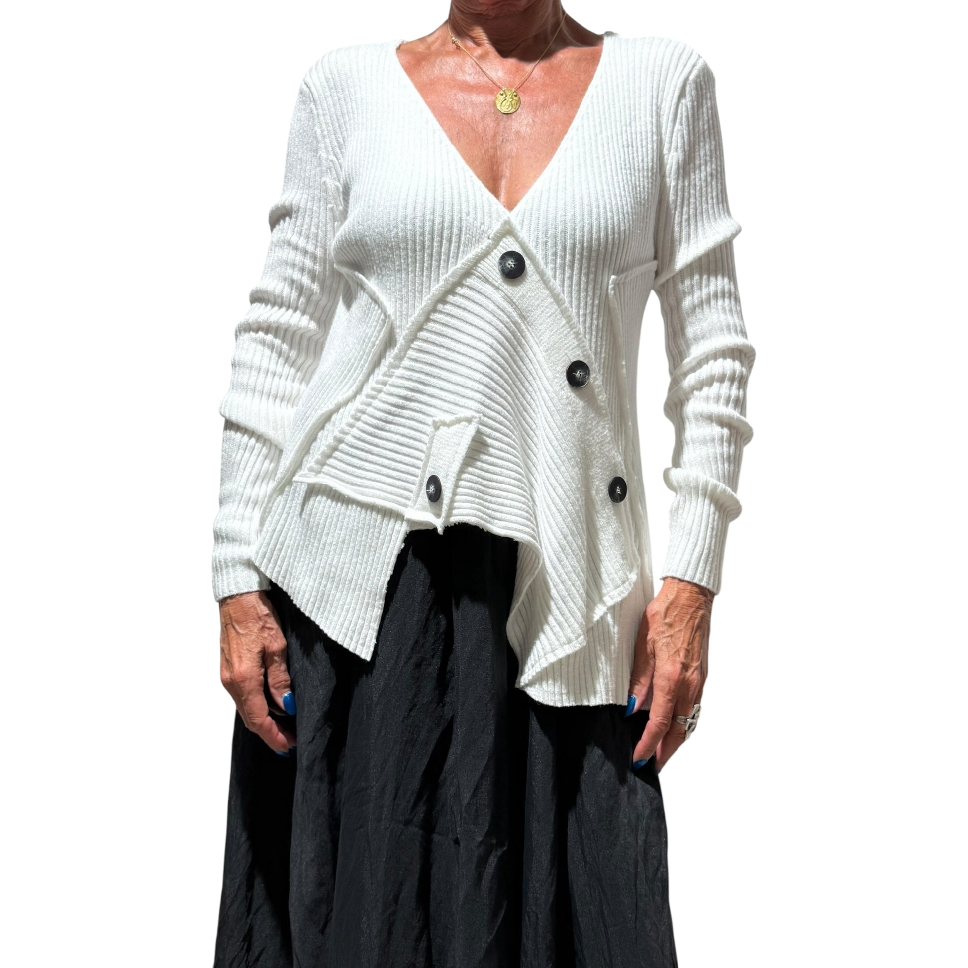 Questo maglione dal design patchwork è realizzato in tessuto elastico in viscosa, garantendo un look moderno e confortevole. Taglia unica .Il decoro bottoni aggiunge un tocco elegante e pratico. Un capo versatile e di tendenza, perfetto per qualsiasi occasione.