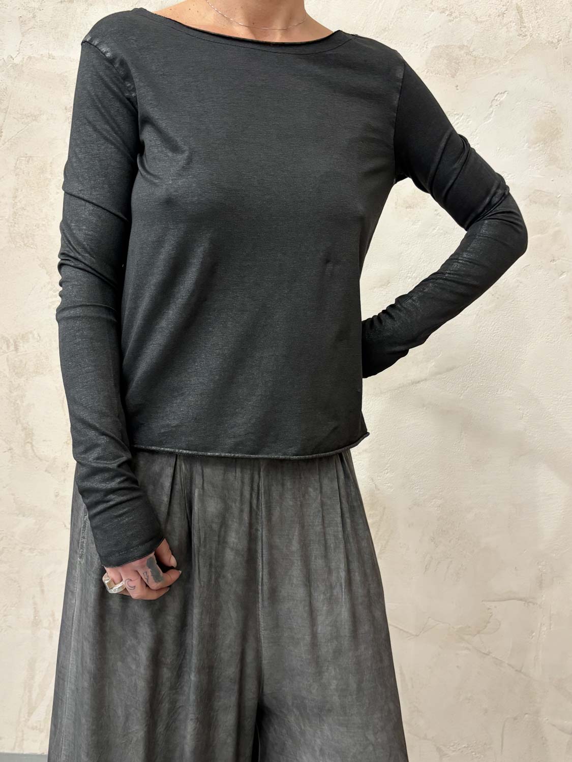 T-shirt manica lunga, fit crop in Jersey Cotone Tinto Freddo e lamina.