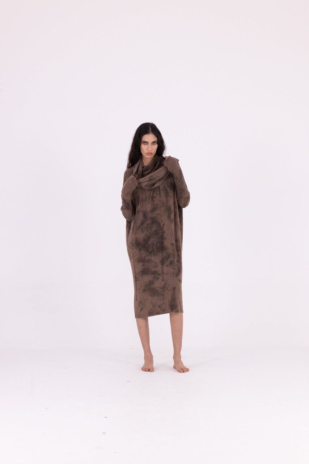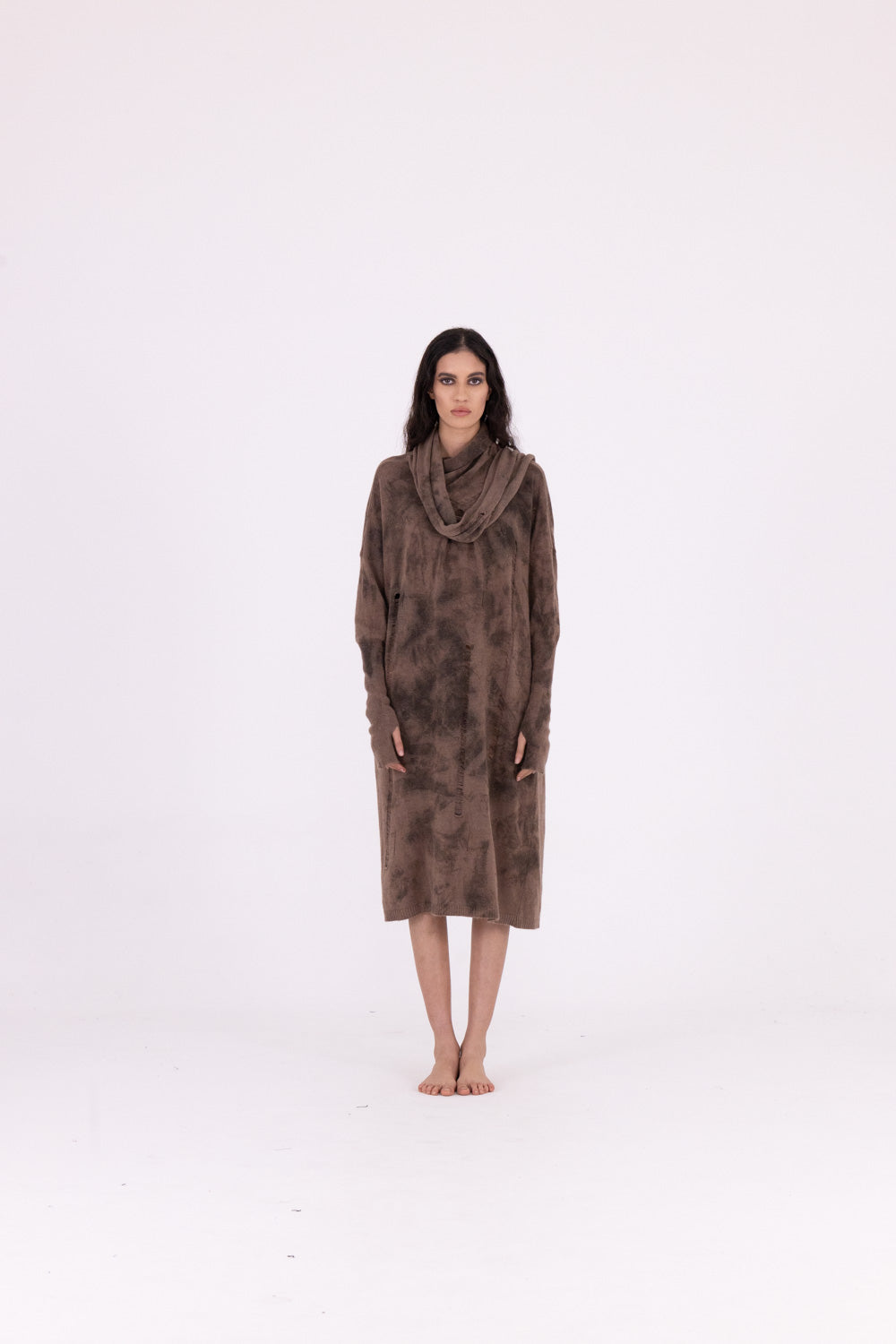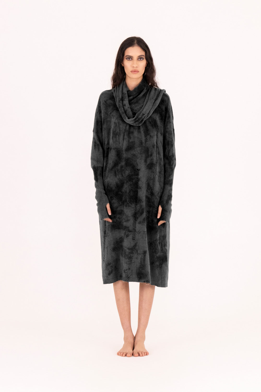 MAXI DRESS KNIT CON DETTAGLIO COLLO ALTO A STOLA E SMAGLIATURE , TAMPONATO A MANO, SFUMATO