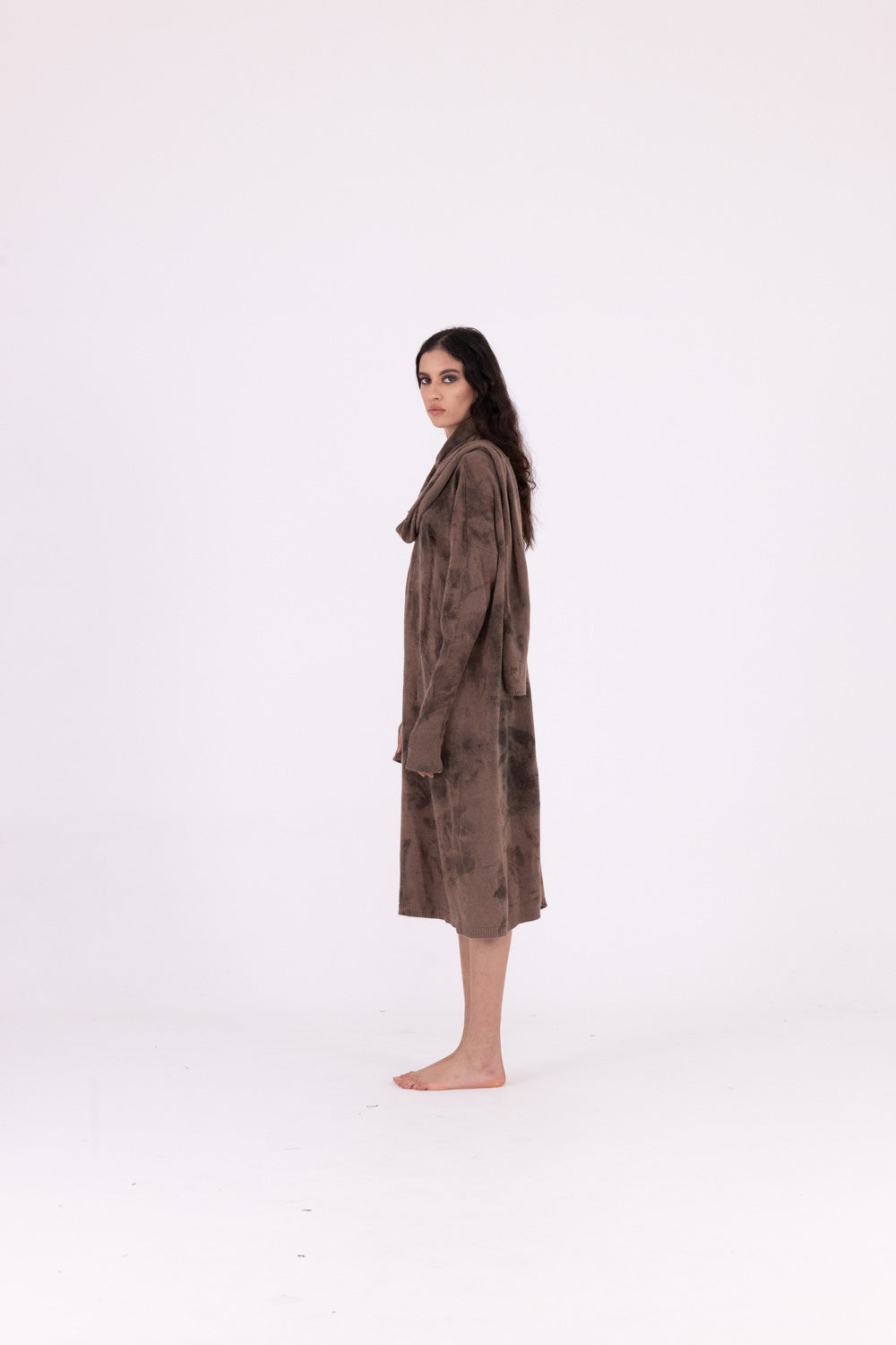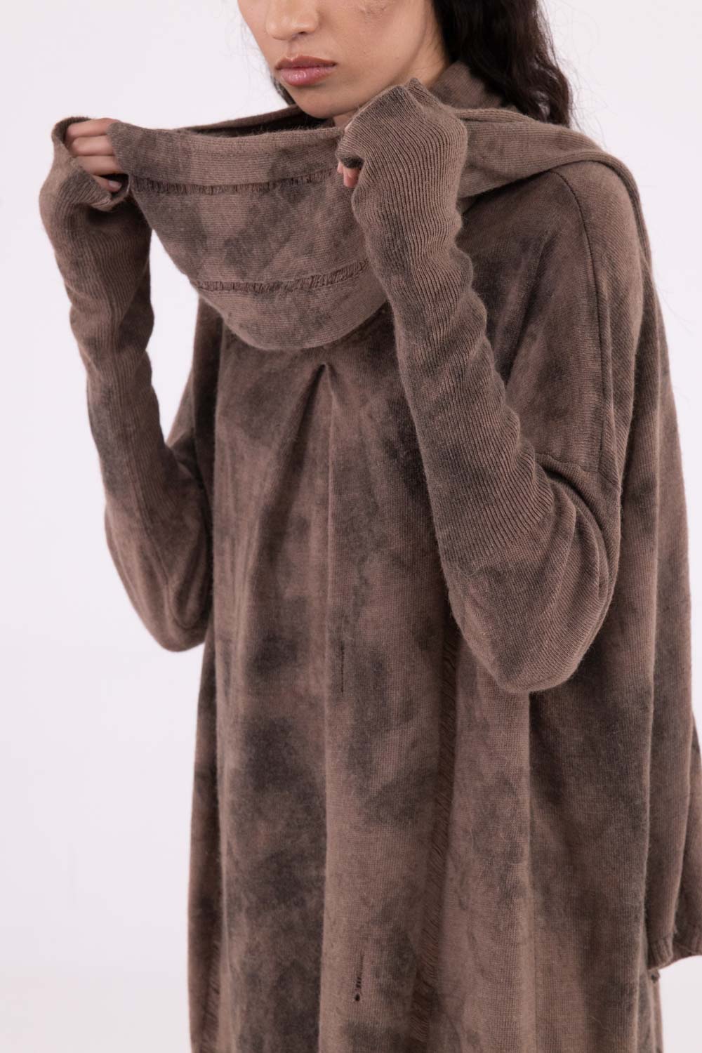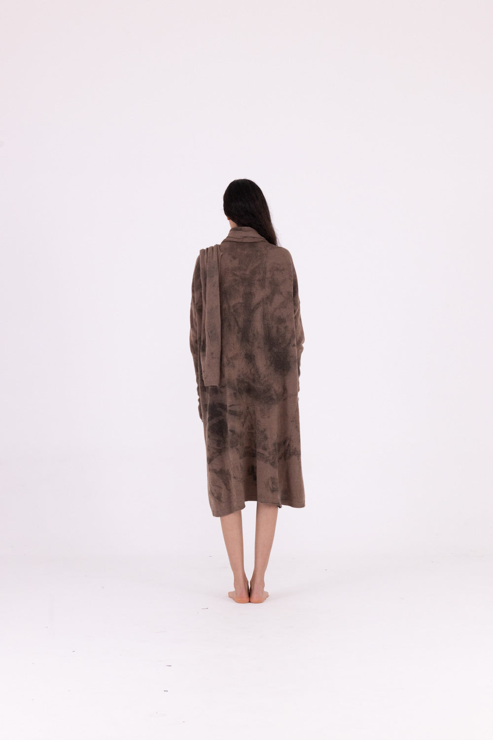 MAXI DRESS KNIT CON DETTAGLIO COLLO ALTO A STOLA E SMAGLIATURE , TAMPONATO A MANO, SFUMATO