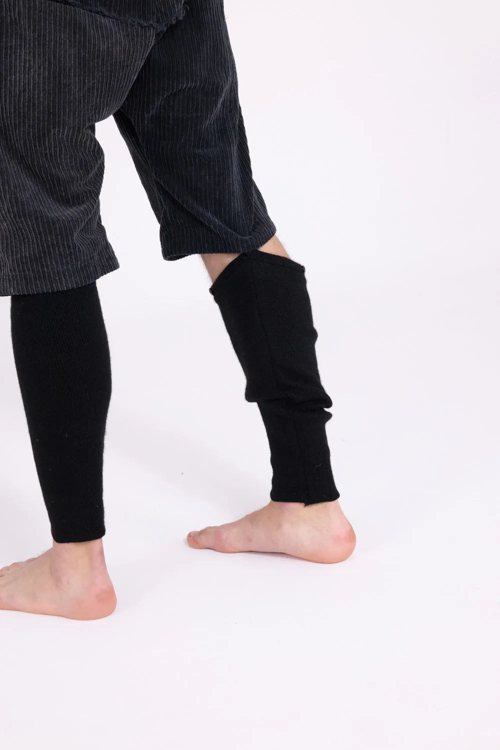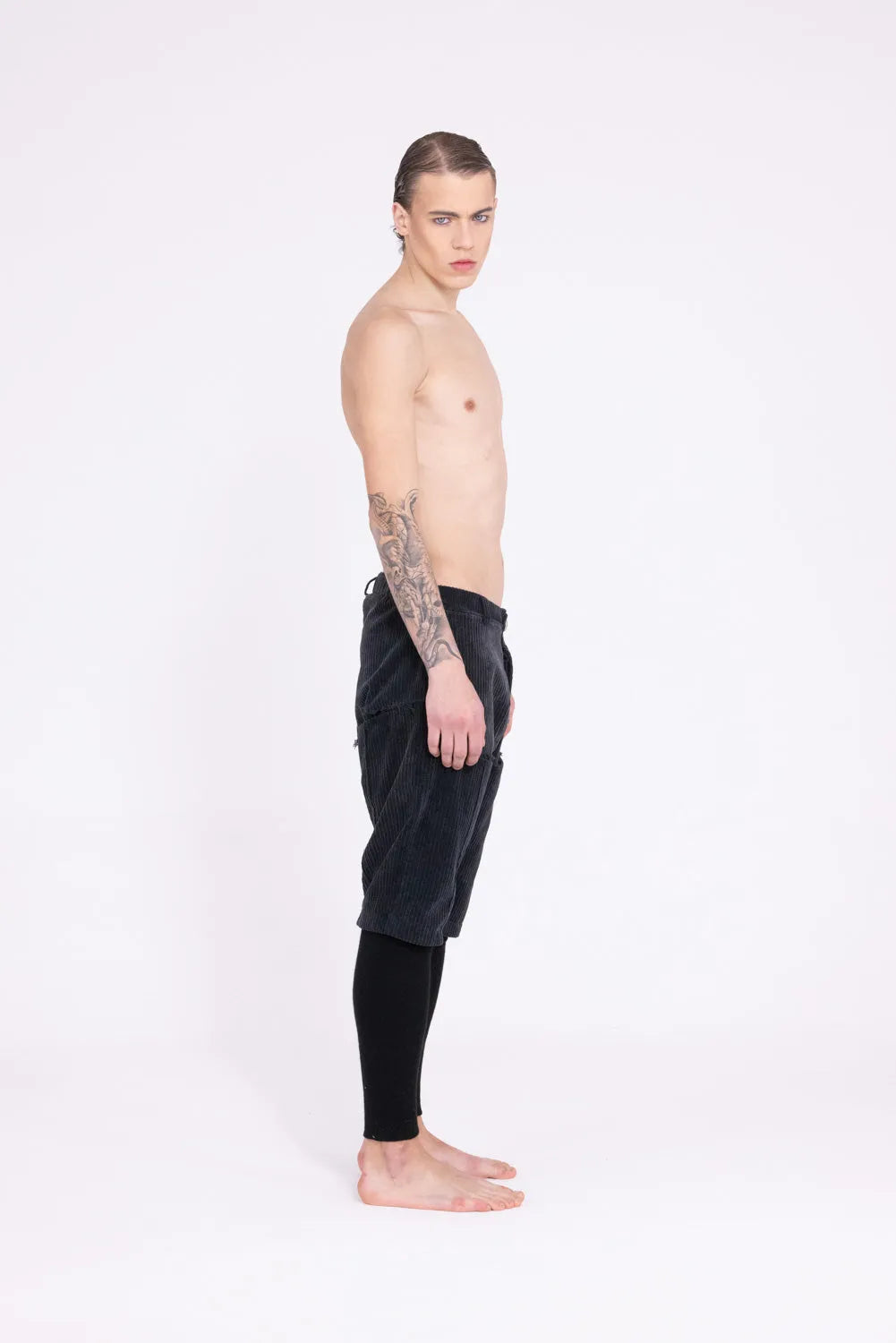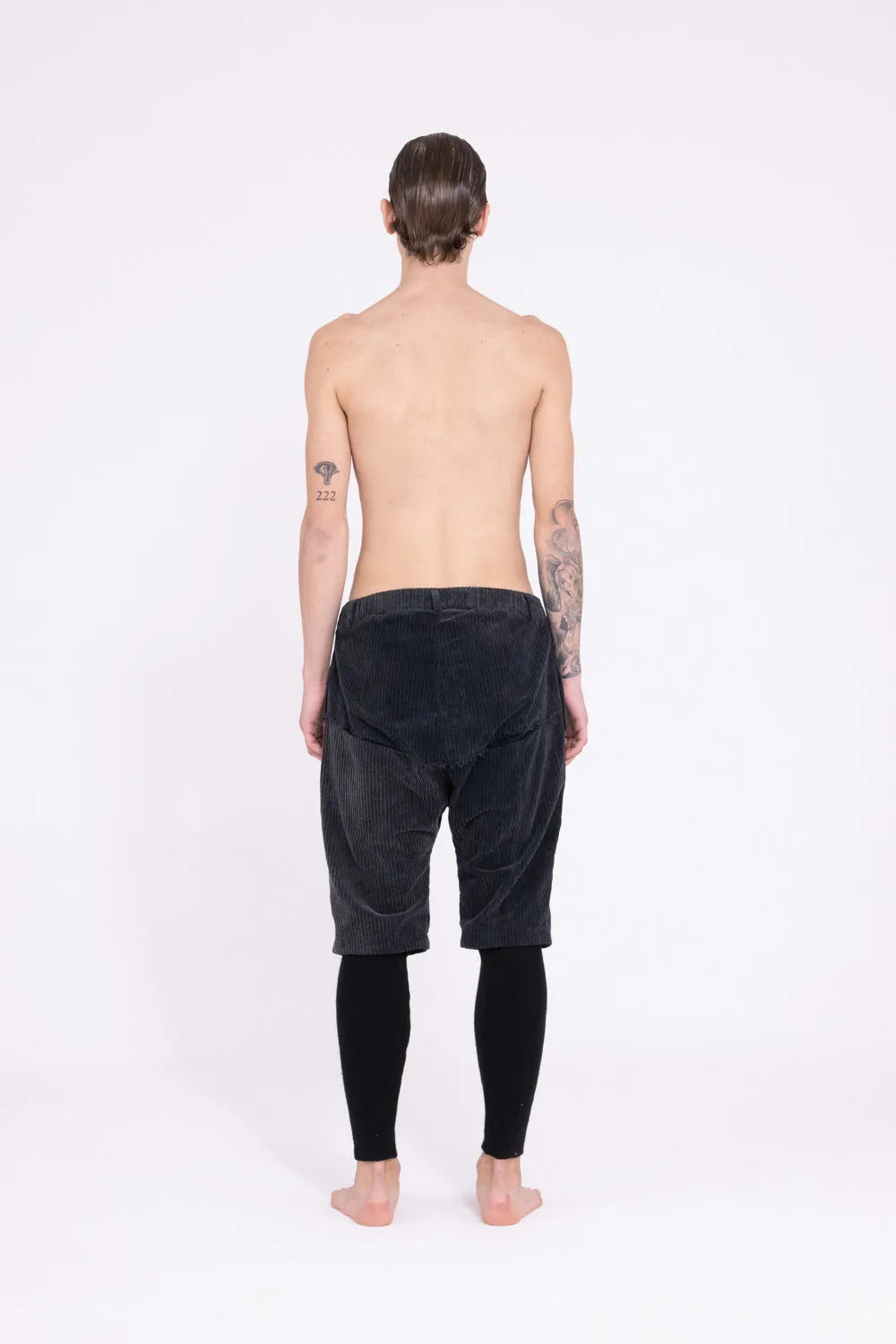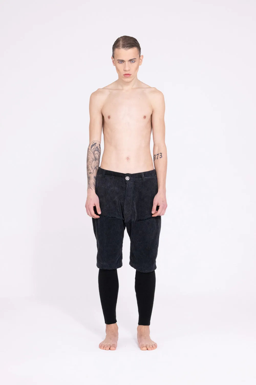 Pantalone dritto regular con elasticatura vita dietro in velluto di cotone maltinto sfumato a mano, lavaggio stone washed con scaldamuscoli staccabili in costina di cotone