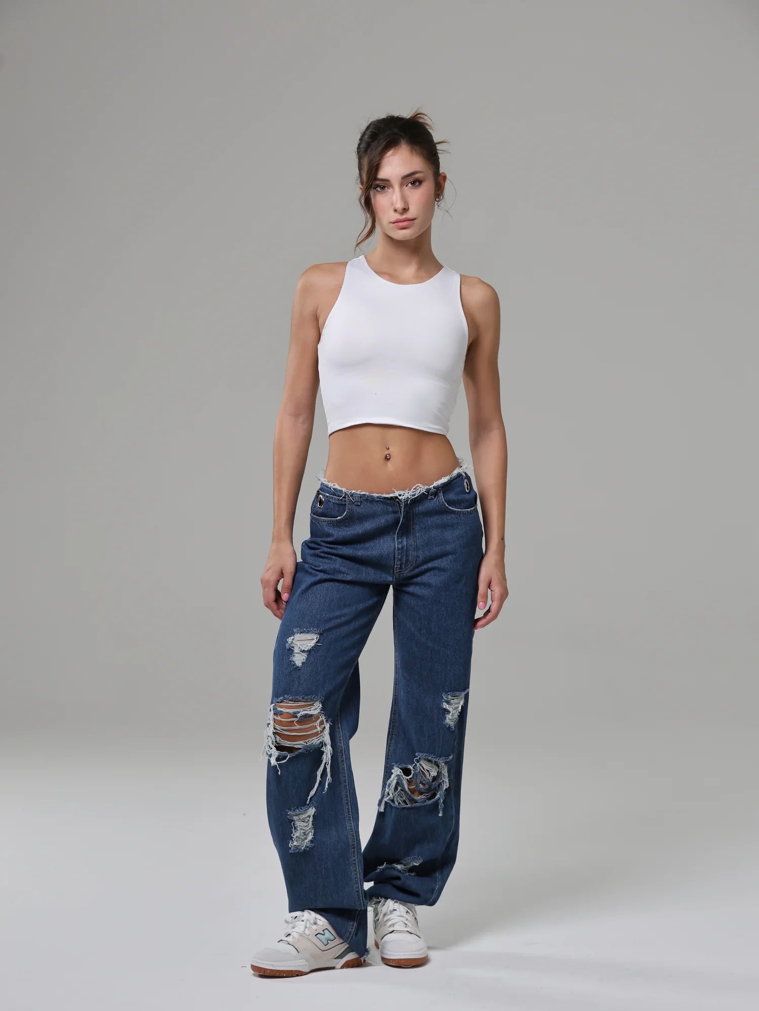 La vita tagliata e sfrangiata aggiunge un dettaglio inaspettato, e gli strappi sulle gambe creano un effetto vissuto.