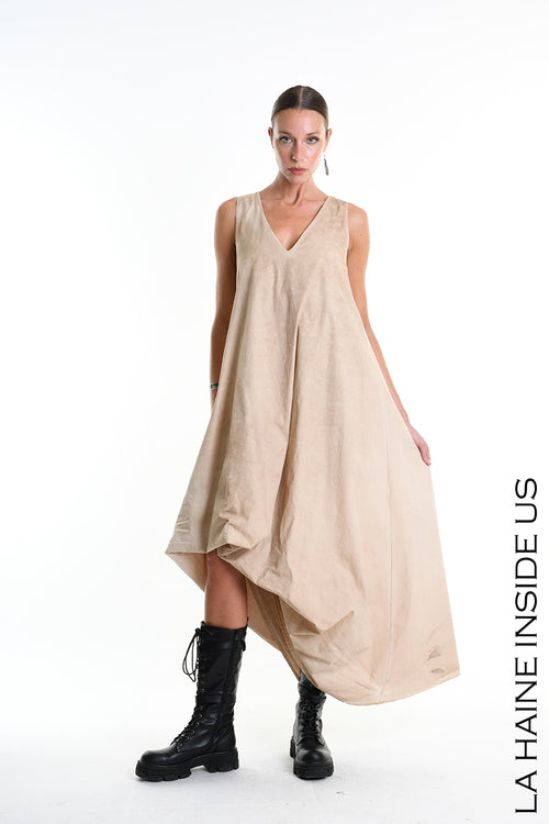 Abito in gabardina di cotone tinto in capo - Drappeggio frontale - Scollatura V - Cintura fusciacca removibile