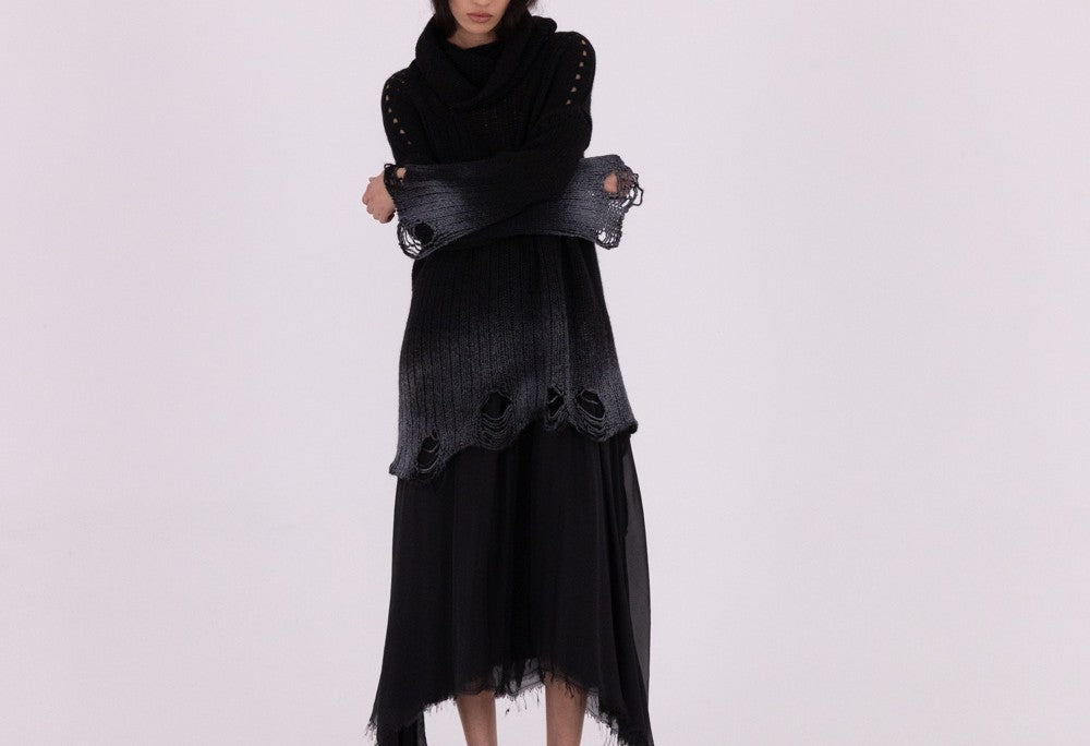 MAGLIA KNIT COLLO ALTO E DETTAGLI CON SMAGLIATURE SPRAY FATTO A MANO A CONTRASTO DEGRADE' SUL FONDO